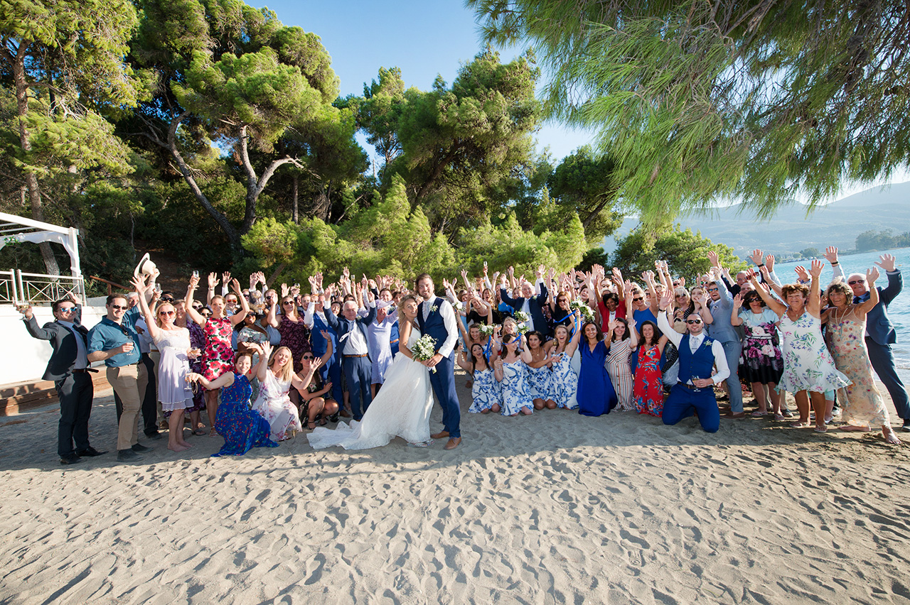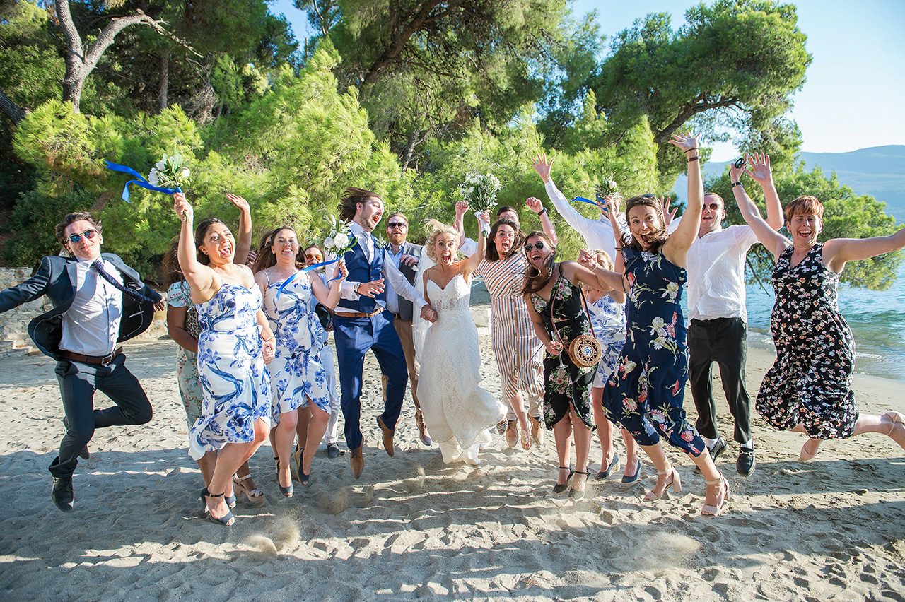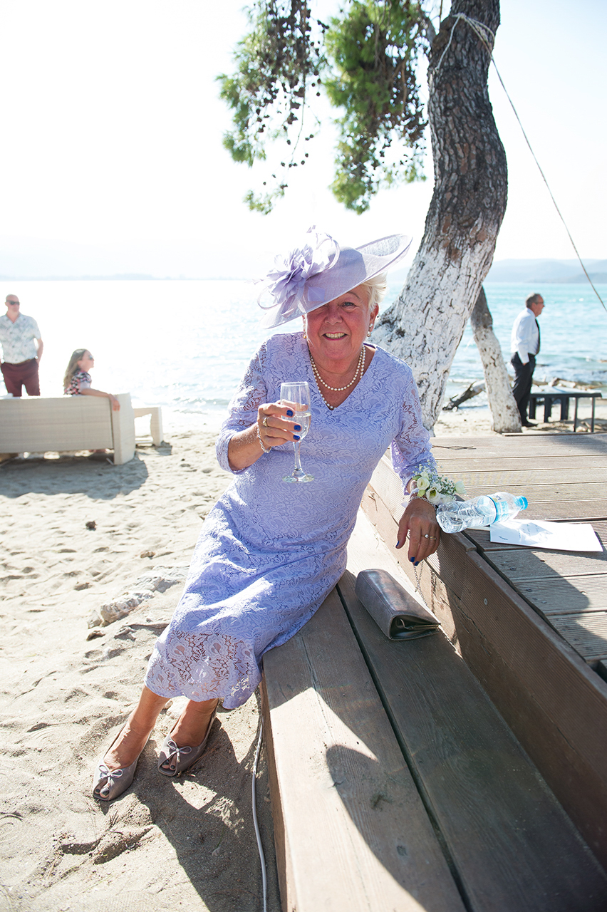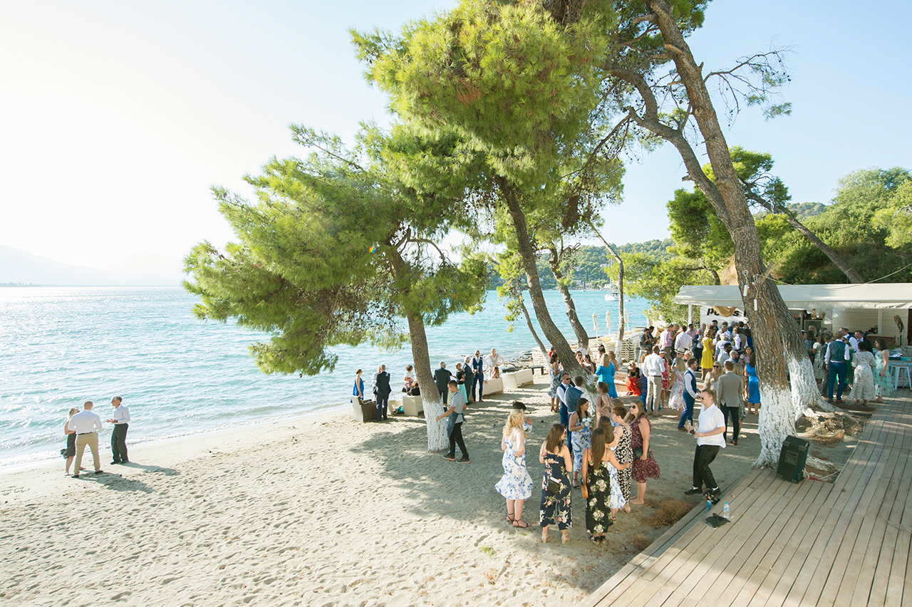 This time, they travelled from London with a different kind of excitement: to exchange their vows on a secluded beach, right by the sea and tucked between fragrant pine trees. The ceremony was intimate and heartfelt, with the sound of the waves in the background and the soft island light wrapping everything in warmth. Afterward, the celebration began with their first cocktail party right on the beach—live music, cocktails in hand, bare feet in the sand, and that effortless summer energy that makes Poros so special.
