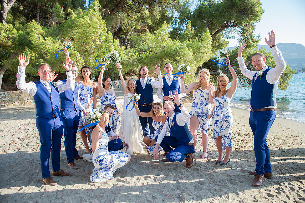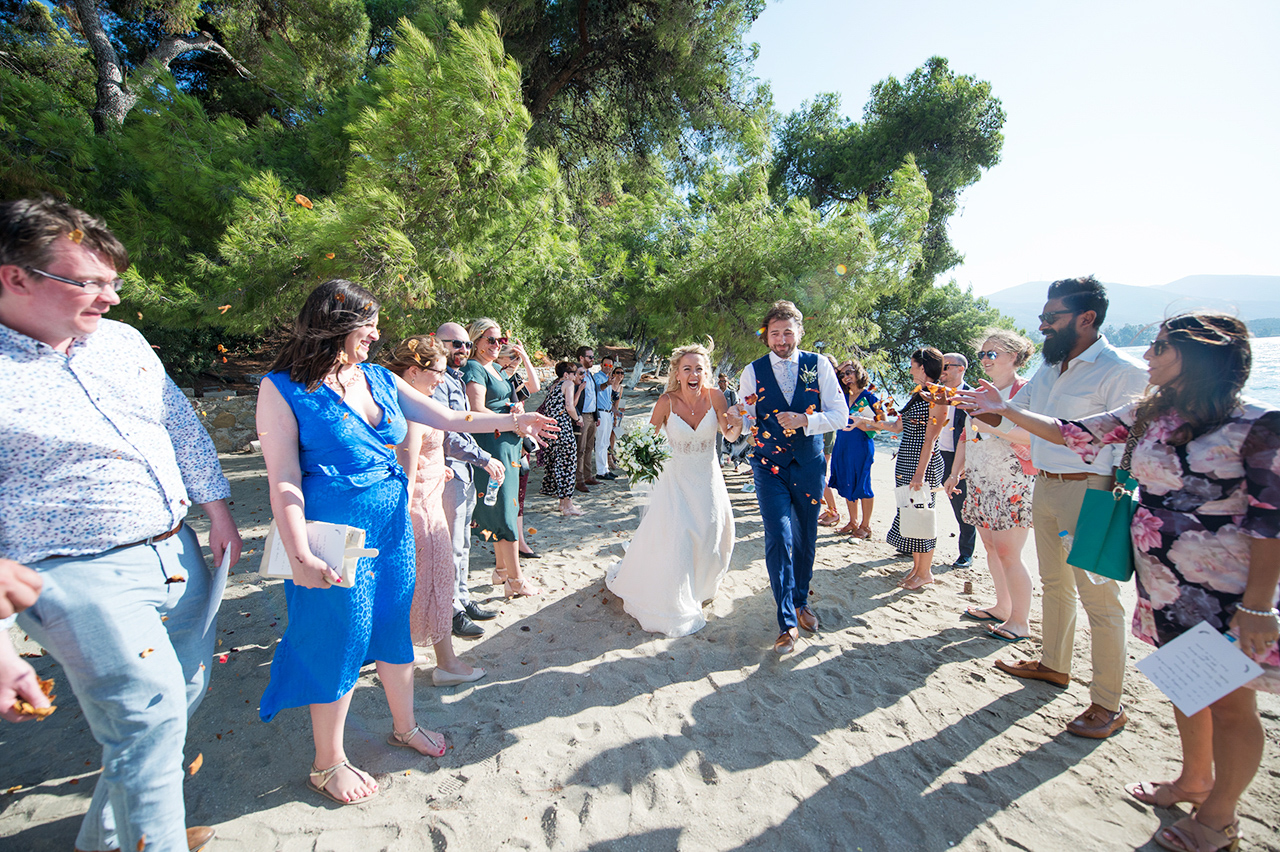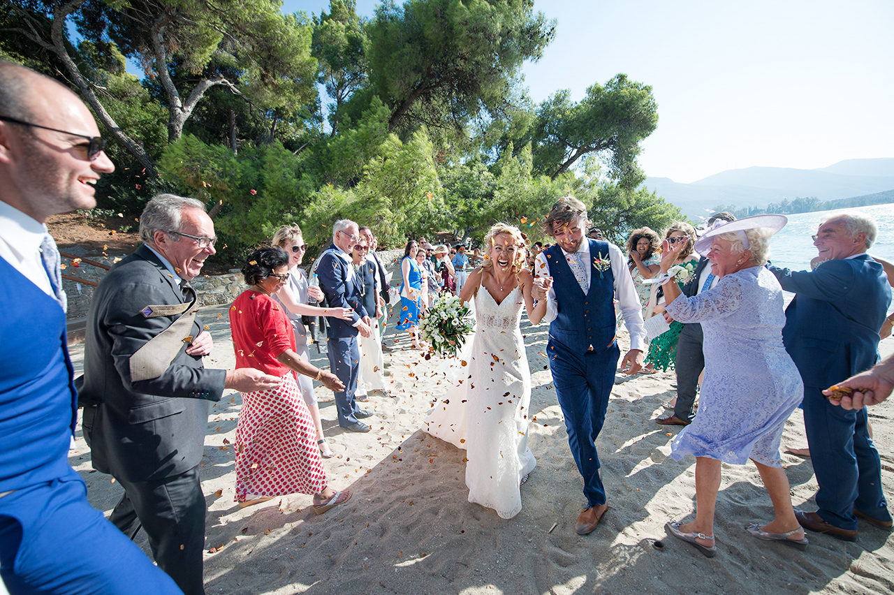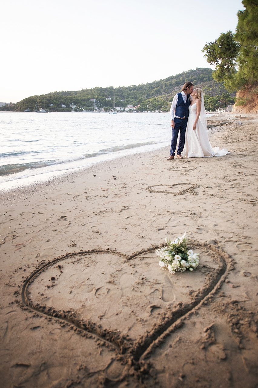 This time, they travelled from London with a different kind of excitement: to exchange their vows on a secluded beach, right by the sea and tucked between fragrant pine trees. The ceremony was intimate and heartfelt, with the sound of the waves in the background and the soft island light wrapping everything in warmth. Afterward, the celebration began with their first cocktail party right on the beach—live music, cocktails in hand, bare feet in the sand, and that effortless summer energy that makes Poros so special.